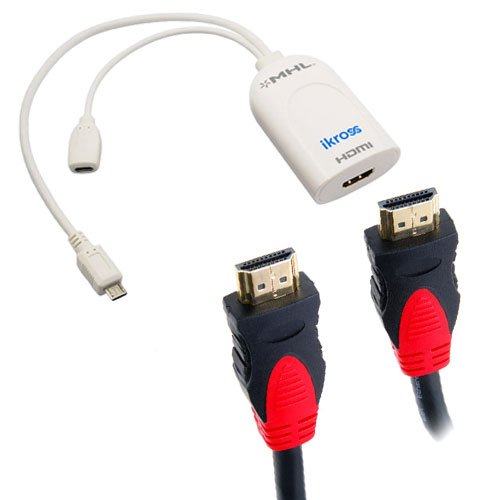 iKross MHL micro-USB to HDMI Adapter with RCP function + 25FT Gold Plated HDMI M/M Cable (Black / Red) for Asus PadFone 2 Station, PadFone 2 ; HTC DROID DNA, One VX, One X+, Droid Incredible 4G LTE, One X Endeavor, One S Ville, Vivid / Raider 4G iKross IKCB13 Micro-USB Male to HDMI Female MHL Adapter Cable with RCP (Remote Control Protocol) for HTC, LG, Samsung